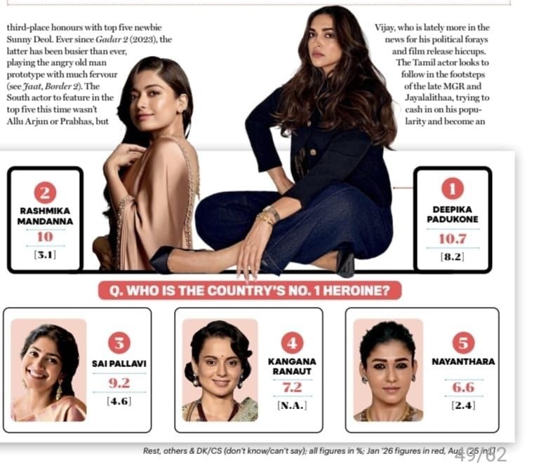 ২০২৫ সালে নতুন ছবি না থাকলেও, দীপিকার নাম ঘিরে আলোচনা, বিতর্ক এবং সামাজিক প্রতিক্রিয়া ছিল অভূতপূর্ব। যার প্রতিফলন মিলেছে পোলের সংখ্যাতত্ত্বেও—গত বছরের ৮.২ রেটিং লাফিয়ে উঠে হয়েছে ১০.৭। এই পরিসংখ্যান শুধুই জনপ্রিয়তার নয়, বরং সাংস্কৃতিক প্রভাবের শক্ত প্রমাণ।